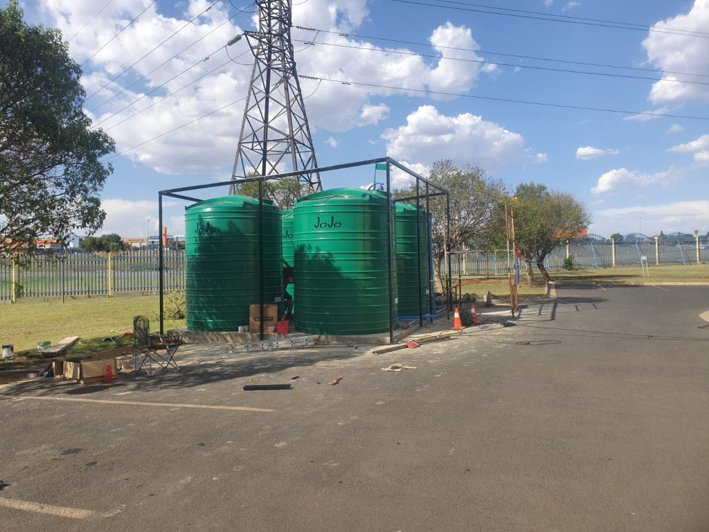 In January 2025, Hi-Echelon Construction completed a critical backup water storage and filtration project at Carnival City, ensuring a sustainable water supply for the bustling entertainment complex. The project involved the installation of multiple large JoJo tanks, each capable of holding thousands of liters of water, securely enclosed within a robust metal-framed structure with protective netting. The setup, as seen in the images, included a series of interconnected pipes for efficient water distribution and filtration, with the team meticulously laying the groundwork to integrate the system into the existing infrastructure. The site was carefully organized, with workers seen managing the installation process, using tools and equipment like ladders, traffic cones, and piping to complete the setup in a safe and systematic manner.